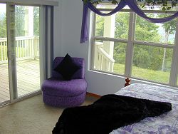 The main bedroom of the lower floor is beautifully decorated in pastel purples. Enjoy direct access to the lower deck and yard from the Purple Bedroom.